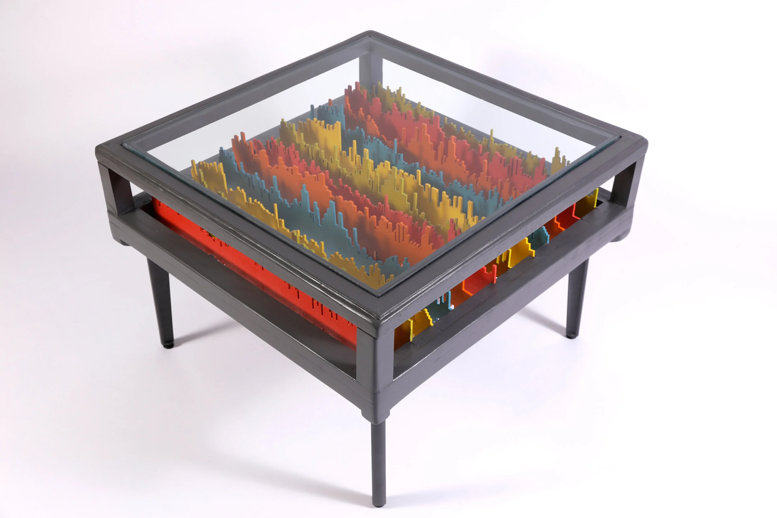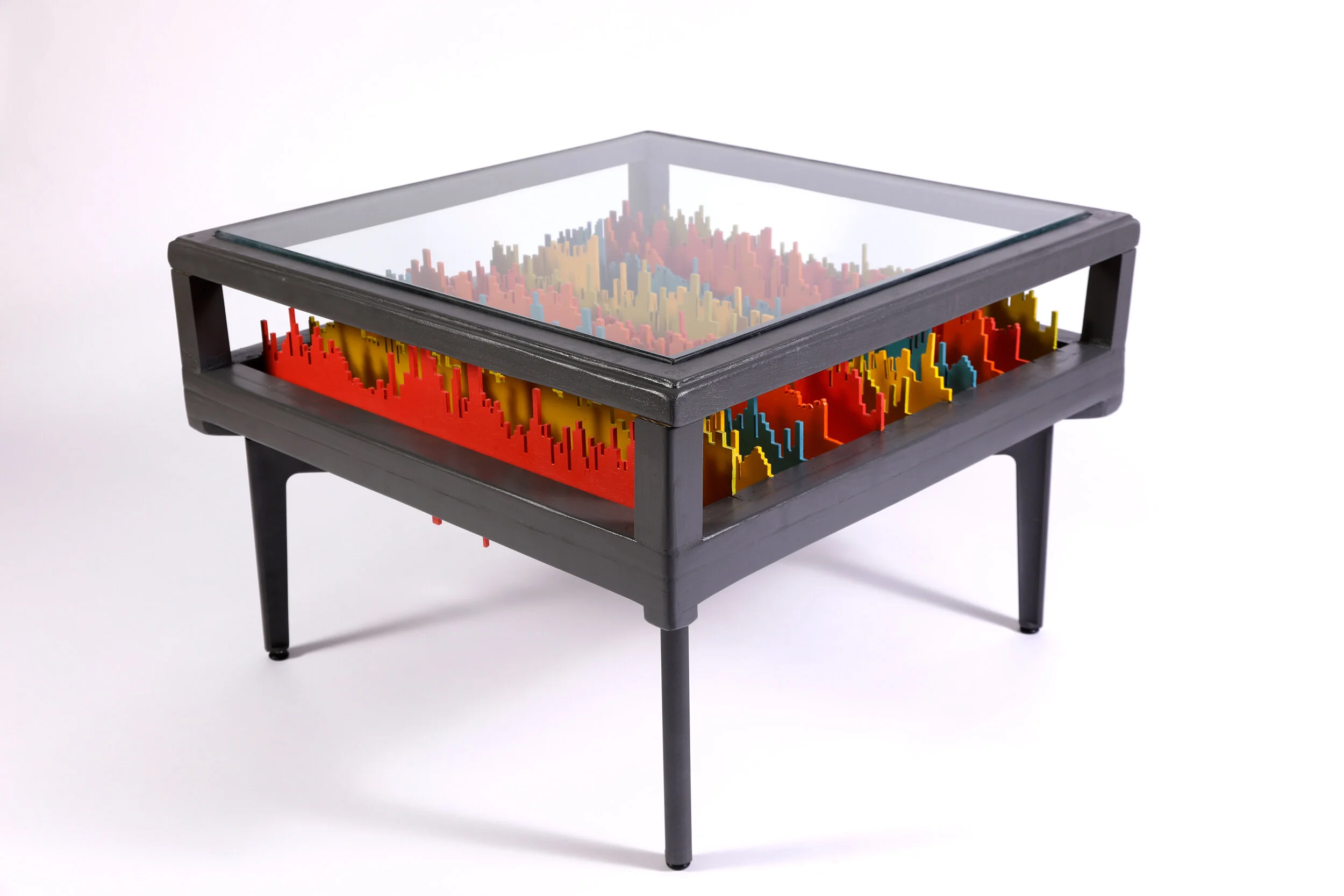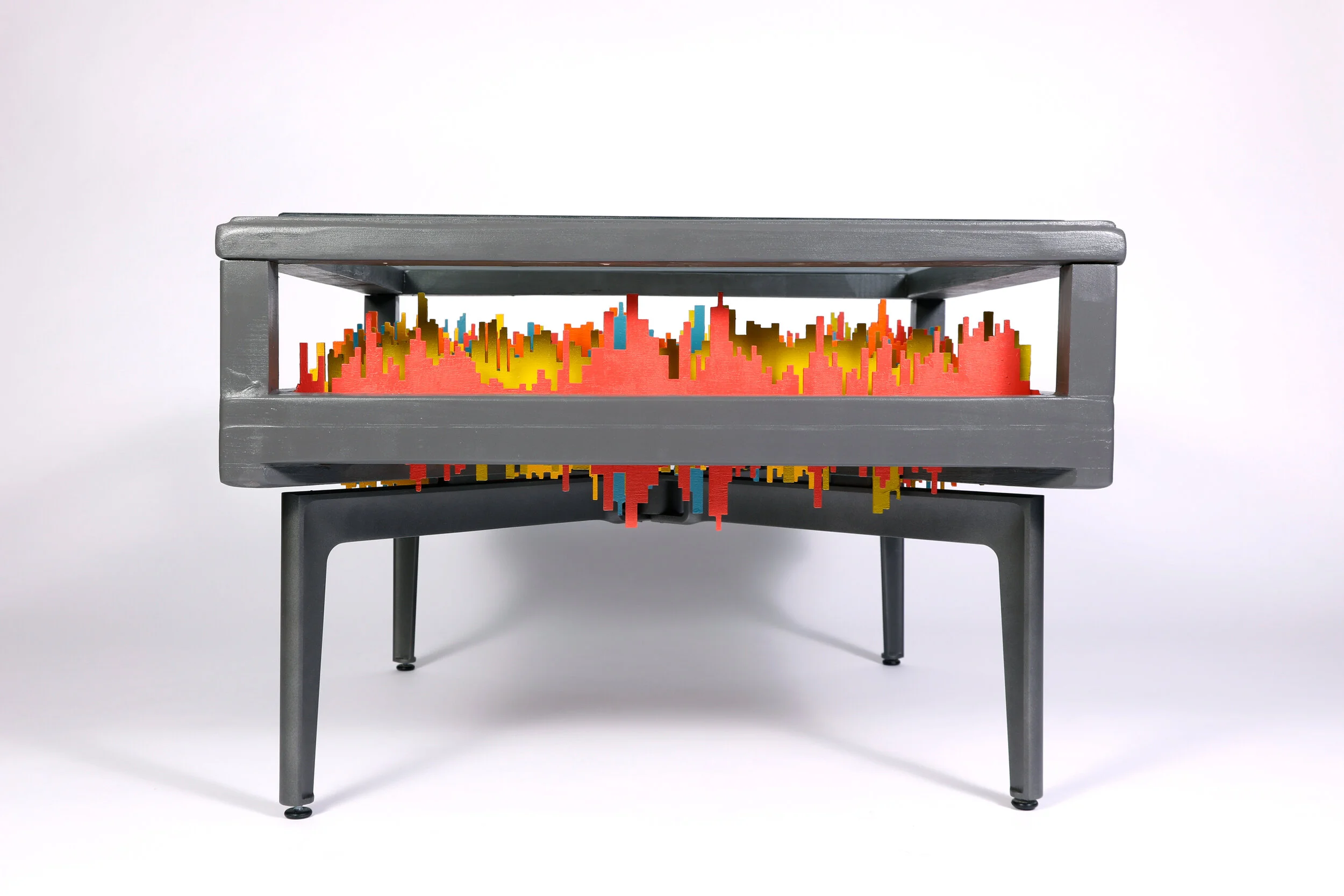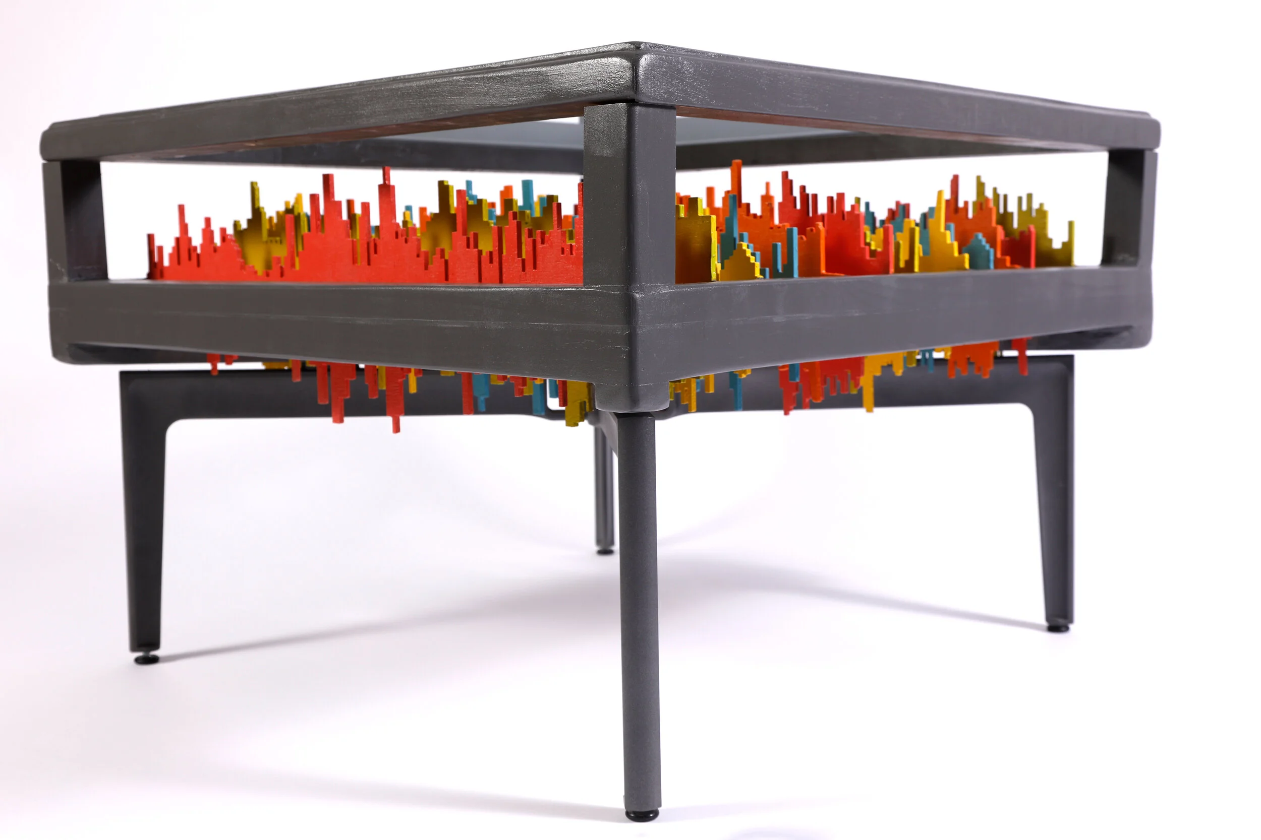 This project is inspired by the lyrics of Childish Gambino’s song Stand Tall. The table reverberates the sound of this song through the sound waves that make up the tables design. The sound waves are created from the chorus of “Stand Tall”.
